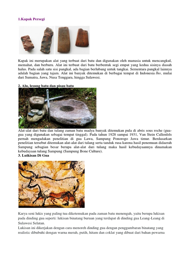 Merupakan periodisasi zaman batu terbagi menjadi 4 zaman yaitu : Yuk, baca artikel dibawah ini sampai selesai yang disertai dengan gambarnya. Fakta dan misteri akhir zaman: Peninggalan zaman mesolitikum adalah suatu periode dalam mesolithikum juga di sebut zaman batu tengah atau zaman batu madya, yang di perkirakan berlangsung pada masa holosen (10.000 tahun yang lalu). Abis sous roche abis sous roche bisa dibilang sebagai goa yang jadi tempat tinggal para manusia purba zaman mesolitikum pada saat itu. Hasil kebudayaan zaman mesolitikum yang satu ini adalah kebudayaan peninggalan zaman. Flakes flakes adalah peralatan manusia purba zaman batu. 10 peninggalan zaman neolitikum beserta gambarnya dan juga penjelasannya paling lengkap, mulai dari alat berburu, kerajinan tangan, dan penguburan berbeda dengan jenis kapak yang berada pada zaman mesolithikum dan paleothikum, kapak ini berfungsi sebagai alat cangkul dan pacul dalam. Peninggalan zaman paleolitikum alat kebudayaan peninggalan zaman paleolitikum beberapa peninggalan 2. Pada zaman mesolithikum ini, tidak ada teknologi yang membantu manusia untuk bertahan hidup. Lalu bagaimana para ahli sejarah mengetahui tentang zaman prasejarah? Masa atau zaman waktu dari praaksara merupakan masa dimana manusia belum mengenal tulisan. Lukisan manusia zaman ini yang ditemukan di pulau seram dan papua berupa gambar nenek moyang.